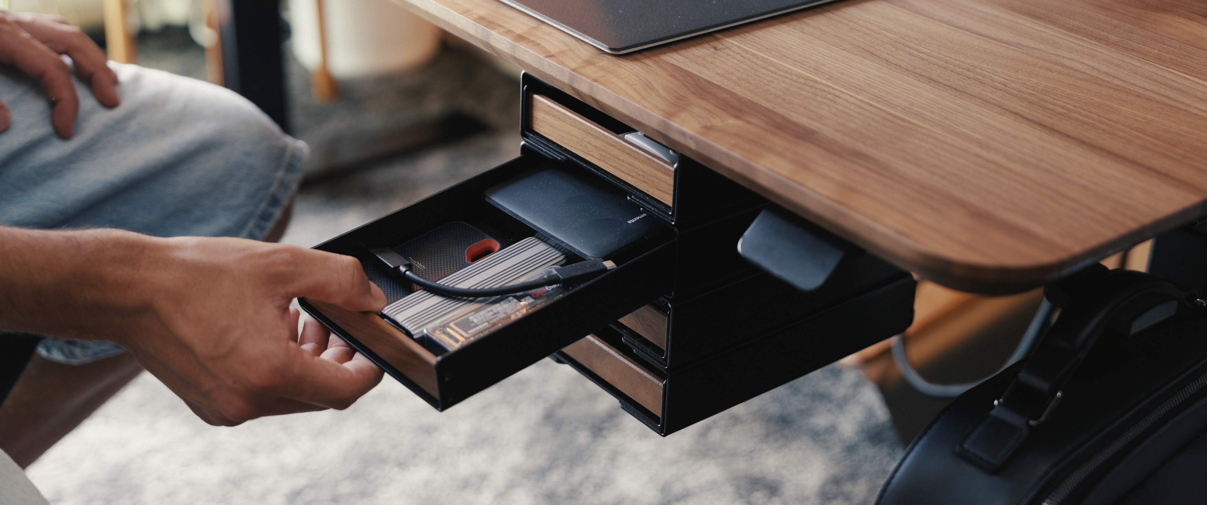 These trays mount underneath the desk using the same modular grid system. But what makes this new version special is that it's fully stackable. You can now screw one tray directly onto another, creating a custom under-desk drawer system tailored to your storage needs.