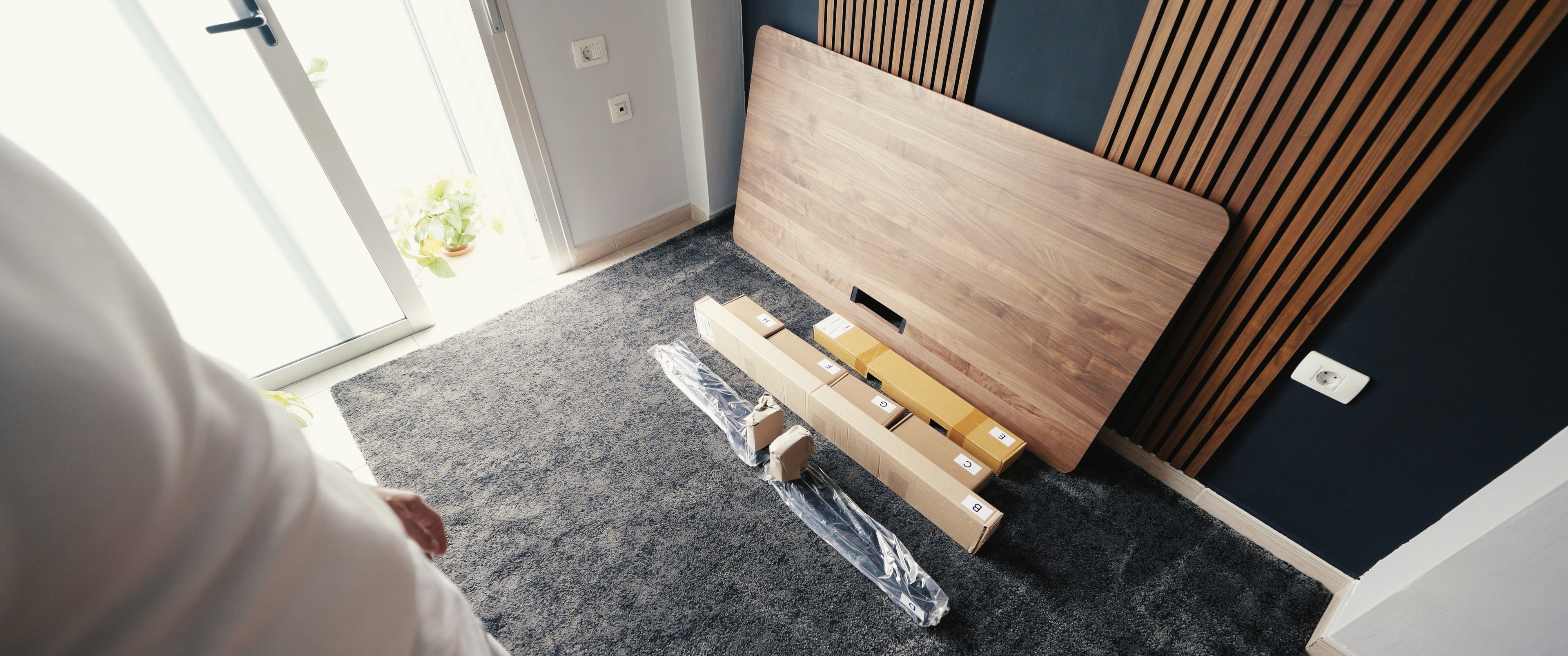 The packaging is smartly labeled (boxes B to H), and everything—from the main frame to the motorized legs—is engineered to slide, snap, or screw together with satisfying precision.