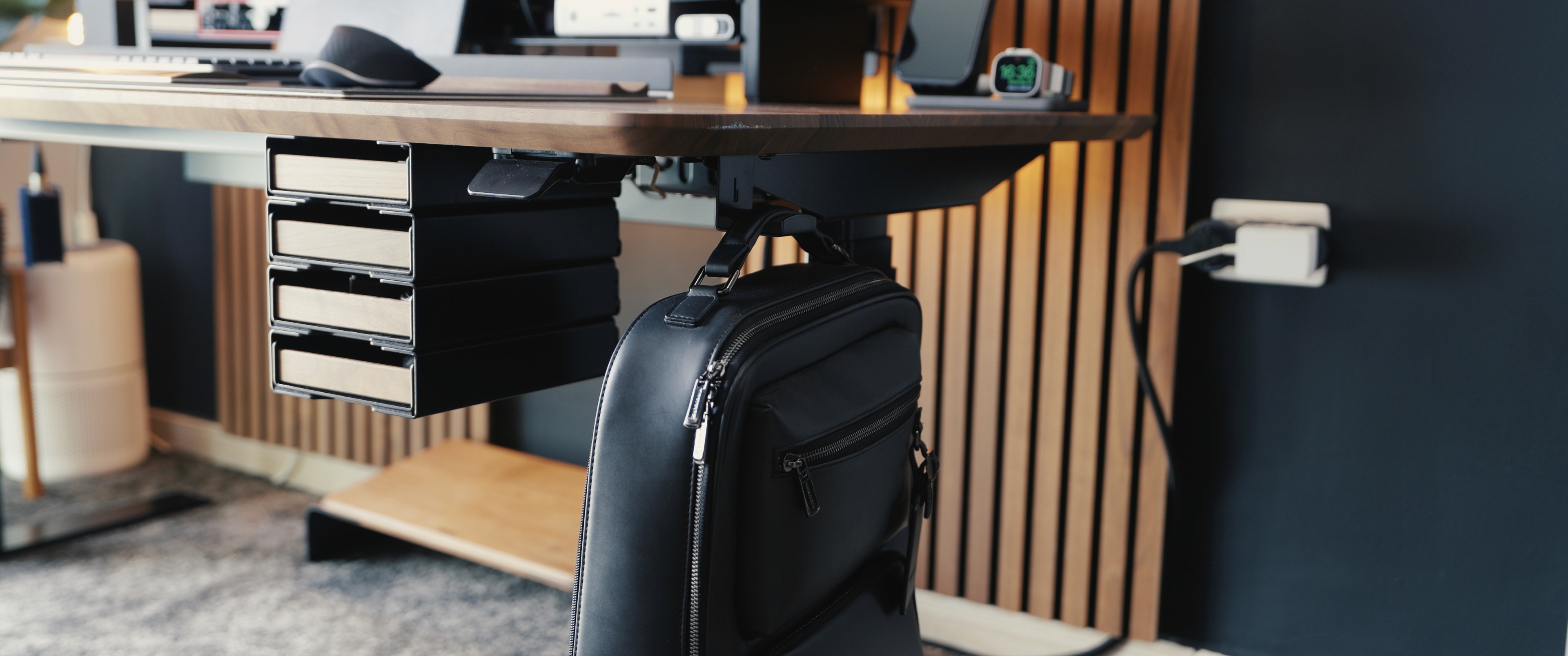 Crafted from powder-coated steel, the hook mounts securely to the desk’s modular grid system without any drilling or adhesive. It blends in seamlessly with the desk’s minimalist aesthetic while adding essential functionality right where you need it.